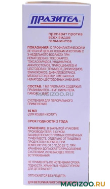 13. Празител суспензию применяют кошкам и котятам с 3-недельного возраста с профилактической и лечебной целью однократно в утреннее кормление с небольшим количеством корма или вводят принудительно с помощью шприца-дозатора из расчета 1 мл суспензии на 1 кг массы животного.