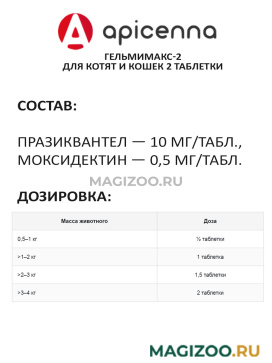 Гельмимакс-2 «для котят и взрослых кошек мелких пород»: празиквантел — 10 мг/табл., моксидектин — 0,5 мг/табл.