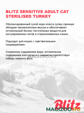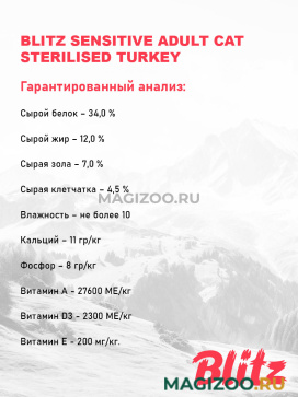 Информация о составе и ингредиентах, цветовом решении, технических и иных характеристиках, стране-изготовителе, внешнем виде и комплекте поставки товара носит справочный характер и основана на последних доступных к моменту публикации сведениях. Доставка данного товара осуществляется во все регионы РФ.BLITZ соответствует по своему качеству зарубежным кормам суперпремиум-класса.