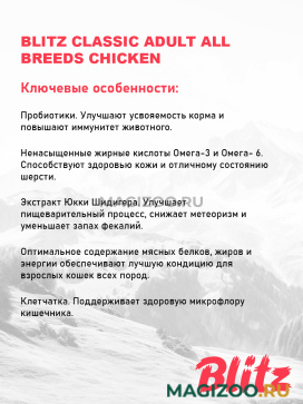Информация о составе и ингредиентах, цветовом решении, технических и иных характеристиках, стране-изготовителе, внешнем виде и комплекте поставки товара носит справочный характер и основана на последних доступных к моменту публикации сведениях. Доставка данного товара осуществляется во все регионы РФ.BLITZ соответствует по своему качеству зарубежным кормам суперпремиум-класса.
