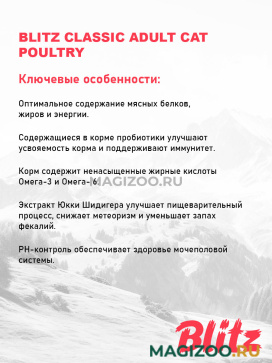 Информация о составе и ингредиентах, цветовом решении, технических и иных характеристиках, стране-изготовителе, внешнем виде и комплекте поставки товара носит справочный характер и основана на последних доступных к моменту публикации сведениях. Доставка данного товара осуществляется во все регионы РФ.BLITZ соответствует по своему качеству зарубежным кормам суперпремиум-класса.