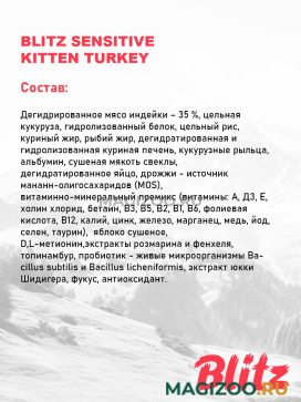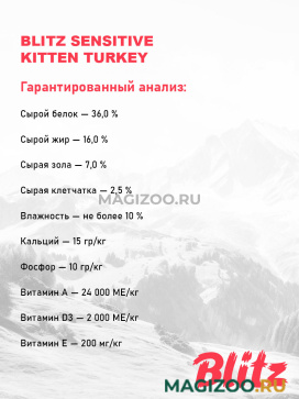 Информация о составе и ингредиентах, цветовом решении, технических и иных характеристиках, стране-изготовителе, внешнем виде и комплекте поставки товара носит справочный характер и основана на последних доступных к моменту публикации сведениях. Доставка данного товара осуществляется во все регионы РФ.BLITZ соответствует по своему качеству зарубежным кормам суперпремиум-класса.