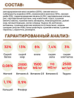 Дегидрированное мясо индейки – 35 %, цельная кукуруза, гидролизованный белок, цельный рис, куриный жир, рыбий жир, дегидратированная и гидролизованная куриная печень, кукурузные рыльца, альбумин, сушеная мякоть свеклы, дегидратированное яйцо, дрожжи - источник мананн-олигосахаридов (MOS), витаминно-минеральный премикс (витамины: А, Д3, Е, холин хлорид, бетаин, В3, В5, В2, В1, В6, фолиевая кислота, В12, калий, цинк, железо, марганец, медь, йод, селен, таурин), яблоко сушеное, D,L-метионин,экстракты розмарина и фенхеля, топинамбур, пробиотик - живые микроорганизмы Bacillus subtilis и Bacillus licheniformis, экстракт юкки Шидигера, фукус, антиоксидант.
