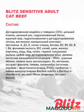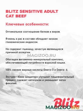 Главная особенность корма BLITZ SENSITIVE ADULT CAT BEEF — использование легкоусвояемого, диетического мяса (говядины и индейки) и щадящих злаков (ячменя и риса), идеальных для кошек с нежным желудком и склонностью к аллергии.