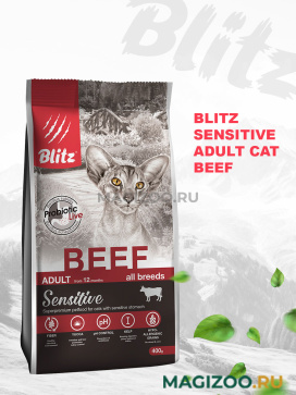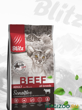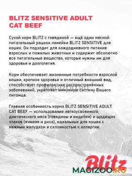 Корм BLITZ SENSITIVE ADULT CAT BEEF отличается интересным вкусом и заманчивым запахом — проверено на привередливых кошках!
