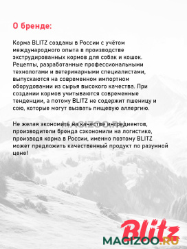 Корма BLITZ созданы в России с учётом международного опыта в производстве экструдированных кормов для собак и кошек. Рецепты, разработанные профессиональными технологами и ветеринарными специалистами, выпускаются на современном импортном оборудовании из сырья высокого качества. При создании кормов учитываются современные тенденции, а потому BLITZ не содержит пшеницу и сою, которые могут вызвать пищевую аллергию.