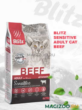 Корм BLITZ SENSITIVE ADULT CAT BEEF отличается интересным вкусом и заманчивым запахом — проверено на привередливых кошках!