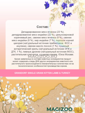 Кроме заявленных в составе животных ингредиентов продукт может содержать следы ДНК других ингредиентов животного или растительного происхождения в незначительных количествах из-за технологических особенностей производства кормов.
