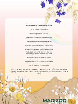 Эти богатые мясом корма не содержат ингредиенты, часто используемые в традиционных кормах, чтобы избежать пищевой непереносимости или аллергии и полностью удовлетворят биологическую потребность питомцев в мясном питании.