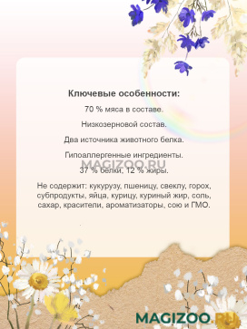Эти богатые мясом корма не содержат ингредиенты, часто используемые в традиционных кормах, чтобы избежать пищевой непереносимости или аллергии и полностью удовлетворят биологическую потребность питомцев в мясном питании.
