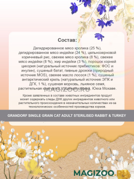 Дегидрированное мясо кролика (25 %), дегидрированное мясо индейки (24 %), цельнозерновой коричневый рис, свежее мясо кролика (8 %), свежее мясо индейки (8 %), жир индейки (3 %), порошок корней цикория (натуральный источник пребиотиков: ФОС и инулин), сушеный батат, пивные дрожжи (природный источник MOS), свежее масло лосося (1 %), сушеный антарктический криль (натуральный источник ЭПК и ДГК, 1 %), сушеная морковь, льняное семя, растительная клетчатка, сушеная клюква, Юкка Мохаве.