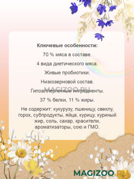 Эти богатые мясом корма не содержат ингредиенты, часто используемые в традиционных кормах, чтобы избежать пищевой непереносимости или аллергии и полностью удовлетворят биологическую потребность питомцев в мясном питании.