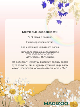 Тщательно отобранные, богатые питательными веществами ингредиенты, помогают предотвратить аллергические реакции и пищевую непереносимость, обеспечивая иммунное и пищеварительное здоровье и отличное физическое состояние для долгой здоровой жизни Вашего питомца.