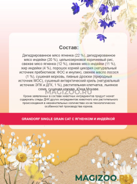 Дегидрированное мясо ягненка (22 %), дегидрированное мясо индейки (20 %), цельнозерновой коричневый рис, свежее мясо ягненка (12 %), свежее мясо индейки (11 %), жир индейки (4 %), порошок корней цикория (натуральный источник пребиотиков: ФОС и инулин), свежее масло лосося (1 %), сушеная морковь, пивные дрожжи (природный источник МОС), сушеный антарктический криль (натуральный источник ЭПК и ДГК, 1 %), растительная клетчатка, льняное семя, сушеная клюква, Юкка Мохаве.