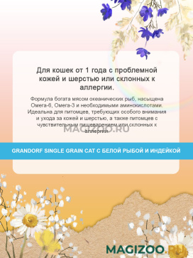 Низкозерновой состав и натуральные гипоаллергенные ингредиенты в сочетании с диетическим мясом белой рыбы, помогают предотвратить аллергические реакции и пищевую непереносимость, обеспечивая иммунное и пищеварительное здоровье.