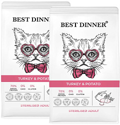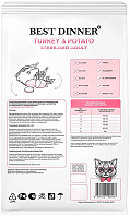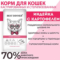 Высококачественный полнорационный корм для кошек Best Dinner с индейкой и картофелем, создан с учетом физиологических потребностей стерилизованных кошек.