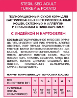 Полнорационный сухой корм для кастрированных и стерилизованных кошек, склонных к аллергии и проблемам с пищеварением, с индейкой и картофелем.