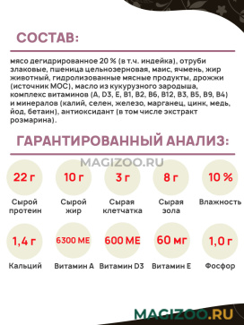 Состав: мясо дегидрированное 20 % (в т.ч. индейка), отруби злаковые, пшеница цельнозерновая, маис, ячмень, жир животный, гидролизованные мясные продукты, дрожжи (источник MOС), масло из кукурузного зародыша, комплекс витаминов (А, D3, Е, В1, В2, В6, В12, В3, В5, В9, В4) и минералов (калий, селен, железо, марганец, цинк, медь, йод, бетаин), антиоксидант (в том числе экстракт розмарина).