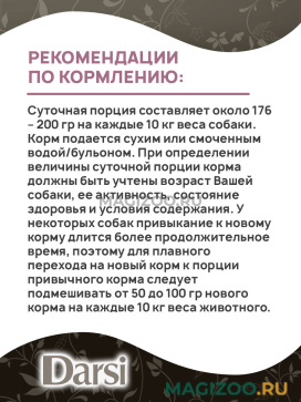 Сухие рационы под торговой маркой DARSI производятся по ГОСТ (Р 55453-2013) на заводе ООО «Провими Пет Фуд Рус» и относится к крупному холдингу Provimi Pet Food Голландия (производитель кормов для домашних животных на территории Западной и Восточной Европы, Азии и Южной Америки).