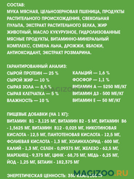 Мясо индейки дегидрированное 30%, кукуруза, продукты растительного происхождения, цельнозерновая пшеница, белок растительный, жир животный, комплекс витаминов и минералов, гидролизованные мясные продукты, дрожжи, семена льна, яблоки, антиоксидант, экстракт розмарина