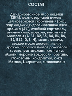 Дегидрированное мясо индейки (28%), цельнозерновой ячмень, цельнозерновой (коричневый) рис, жир индейки, гидролизованное мясо кролика (4%), сушёный картофель, льняное семя, морковь, витамины и минералы (А, B1, В2, B3, B4, B5, B6, B9, B12, D, Е, H), мякоть свеклы, свежее масло лосося, пивные дрожжи, порошок плодов рожкового дерева, растительная клетчатка, яблоки, морские водоросли, орегано, глюкозамин, хондроитин, юкка Мохаве, L-карнитин, антиоксидант.