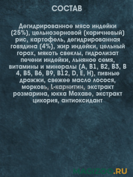 Дегидрированное мясо индейки (25%), цельнозерновой (коричневый) рис, картофель, дегидрированная говядина (4%), жир индейки, цельный горох, мякоть свеклы, гидролизат печени индейки, льняное семя, витамины и минералы (А, B1, В2, В3, В4, В5, В6, В9, В12, D, Е, H), пивные дрожжи, свежее масло лосося, морковь, L-карнитин, экстракт розмарина, юкка Мохаве, экстракт цикория, антиоксидант.