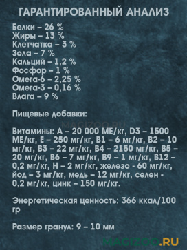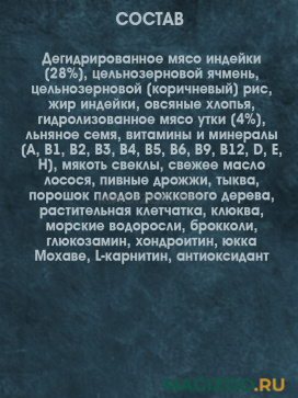 Дегидрированное мясо индейки (28%), цельнозерновой ячмень, цельнозерновой (коричневый) рис, жир индейки, овсяные хлопья, гидролизованное мясо утки (4%), льняное семя, витамины и минералы (А, B1, В2, B3, B4, B5, B6, B9, B12, D, Е, H), мякоть свеклы, свежее масло лосося, пивные дрожжи, тыква, порошок плодов рожкового дерева, растительная клетчатка, клюква, морские водоросли, брокколи, глюкозамин, хондроитин, юкка Мохаве, L-карнитин, антиоксидант.