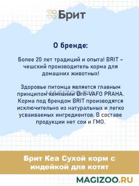 Информация о составе и ингредиентах, цветовом решении, технических и иных характеристиках, стране-изготовителе, внешнем виде и комплекте поставки товара носит справочный характер и основана на последних доступных к моменту публикации сведениях. Доставка данного товара осуществляется во все регионы РФ.Здоровье питомца является главным принципом компании Brit-VAFO PRAHA. Корма под брендом BRIT производятся исключительно из натуральных и легко усваиваемых ингредиентов. В составе продукции нет сои и ГМО.