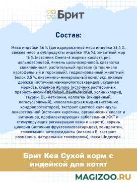 Мясо индейки 46 % (дегидрированное мясо индейки 26,4 %, свежее мясо и субпродукты индейки 19,6 %), животный жир 16 % (источник Омега-6 жирных кислот), рис цельнозерновой, ячмень цельнозерновой, клетчатка свекловичная, растительный протеин (в том числе картофельный и гороховый), гидролизованный животный белок 3,5 %, витаминно-минеральный комплекс, пивные дрожжи (источник маннанолигосахаридов), сушеная морковь, сушеное яблоко (источник растворимых пребиотических волокон), льняное семя, холин-хлорид, таурин, DL-метионин, коллаген (очищенный, легкоусвояемый), новозеландская мидия (источник хондропротекторов), экстракт цветков календулы лекарственной (источник каротина, органических кислот и витаминов, профилактирующих заболевания ЖКТ и стимулирующих регенерацию кожи и шерсти), корень цикория (источник фруктоолигосахаридов), хондроитин, глюкозамин, антиоксиданты (витамин Е, экстракт розмарина, натуральные токоферолы), юкка Шидигера.