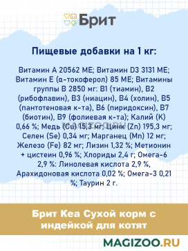 Пищевые добавки (на 1 кг): Витамин A 20562 МЕ; Витамин D3 3131 МЕ; Витамин Е (α-токоферол) 85 МЕ; Витамины группы В 2850 мг: В1 (тиамин), В2 (рибофлавин), В3 (ниацин), В4 (холин), В5 (пантотеновая к-та), В6 (пиридоксин), В7 (биотин), В9 (фолиевая к-та); Калий (K) 0,66 %; Медь (Cu) 15,3 мг; Цинк (Zn) 195,3 мг; Селен (Se) 0,34 мг; Марганец (Mn) 12 мг; Железо (Fe) 82 мг; Лизин 1,32 %; Метионин + цистеин 0,96 %; Хлориды 2,4 г; Омега-6 2,9 %: Линолевая кислота 2,9 %, Арахидоновая кислота 0,02 %; Омега-3 0,21 %; Таурин 2 г.