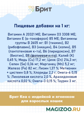 Питательные добавки (на 1 кг): Витамин A 20321 МЕ; Витамин D3 3308 МЕ; Витамин Е (α-токоферол) 85 МЕ; Витамины группы В 2605 мг: В1 (тиамин), В2 (рибофлавин), В3 (ниацин), В4 (холин), В5 (пантотеновая к-та), В6 (пиридоксин), В7 (биотин), В9 (фолиевая к-та); Калий (K) 0,65 %; Медь (Cu) 17,2 мг; Цинк (Zn) 214,3 мг; Селен (Se) 0,36 мг; Марганец (Mn) 5,2 мг; Железо (Fe) 82 мг; Лизин 1,37 %; Метионин + цистеин 0,8 %; Хлориды 2,2 г; Омега-6 0,15 %: Линолевая кислота 2,0 %, Арахидоновая кислота 0,02 %; Омега-3 0,15 %; Таурин 3 мг.