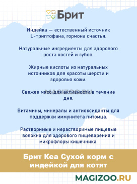 Информация о составе и ингредиентах, цветовом решении, технических и иных характеристиках, стране-изготовителе, внешнем виде и комплекте поставки товара носит справочный характер и основана на последних доступных к моменту публикации сведениях. Доставка данного товара осуществляется во все регионы РФ.Здоровье питомца является главным принципом компании Brit-VAFO PRAHA. Корма под брендом BRIT производятся исключительно из натуральных и легко усваиваемых ингредиентов. В составе продукции нет сои и ГМО.