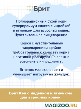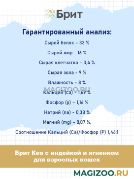 Информация о составе и ингредиентах, цветовом решении, технических и иных характеристиках, стране-изготовителе, внешнем виде и комплекте поставки товара носит справочный характер и основана на последних доступных к моменту публикации сведениях. Доставка данного товара осуществляется во все регионы РФ.Здоровье питомца является главным принципом компании Brit-VAFO PRAHA. Корма под брендом BRIT производятся исключительно из натуральных и легко усваиваемых ингредиентов. В составе продукции нет сои и ГМО.