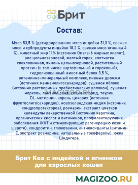 Мясо 53,5 % (дегидрированное мясо индейки 31,3 %, свежее мясо и субпродукты индейки 18,2 %, свежее мясо ягненка 4 %), животный жир 11 % (источник Омега-6 жирных кислот), рис цельнозерновой, желтый горох, клетчатка свекловичная, ячмень цельнозерновой, растительный протеин (в том числе картофельный и гороховый), гидролизованный животный белок 3,5 %, витаминно-минеральный комплекс, пивные дрожжи (источник маннанолигосахаридов), сушеное яблоко (источник растворимых пребиотических волокон), сушеная морковь, льняное семя, холин-хлорид, таурин, DL-метионин, корень цикория (источник фруктоолигосахаридов), новозеландская мидия (источник хондропротекторов), розмарин, экстракт цветков календулы лекарственной (источник каротина, органических кислот и витаминов, профилактирующих заболевания ЖКТ и стимулирующих регенерацию кожи и шерсти), хондроитин, глюкозамин, антиоксиданты (витамин Е, экстракт розмарина, натуральные токоферолы), юкка Шидигера.