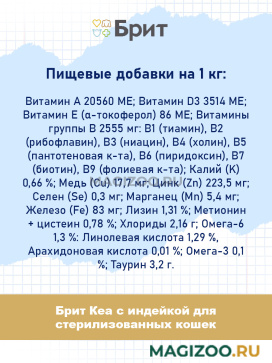 Питательные добавки (на 1 кг): Витамин A 20560 МЕ; Витамин D3 3514 МЕ; Витамин Е (α-токоферол) 86 МЕ; Витамины группы В 2555 мг: В1 (тиамин), В2 (рибофлавин), В3 (ниацин), В4 (холин), В5 (пантотеновая к-та), В6 (пиридоксин), В7 (биотин), В9 (фолиевая к-та); Калий (K) 0,66 %; Медь (Cu) 17,7 мг; Цинк (Zn) 223,5 мг; Селен (Se) 0,3 мг; Марганец (Mn) 5,4 мг; Железо (Fe) 83 мг; Лизин 1,31 %; Метионин + цистеин 0,78 %; Хлориды 2,16 г; Омега-6 1,3 %: Линолевая кислота 1,29 %, Арахидоновая кислота 0,01 %; Омега-3 0,1 %; Таурин 3,2 г.