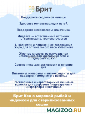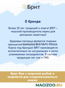 Информация о составе и ингредиентах, цветовом решении, технических и иных характеристиках, стране-изготовителе, внешнем виде и комплекте поставки товара носит справочный характер и основана на последних доступных к моменту публикации сведениях. Доставка данного товара осуществляется во все регионы РФ.Здоровье питомца является главным принципом компании Brit-VAFO PRAHA. Корма под брендом BRIT производятся исключительно из натуральных и легко усваиваемых ингредиентов. В составе продукции нет сои и ГМО.