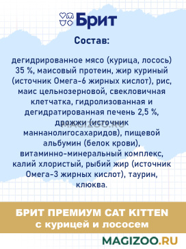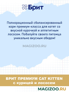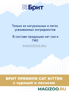 Перевела своего котенка на корм отечественного бренда фирмы Брит. Есть в свободном доступе в любом зоомагазине. Среди всей линейки выбрала со вкусом курицы. Котенок уже с его кушает с большой радостью. Аппетит у него хороший. Выглядит здоровым, игривым и активным. Корм хорошего качества, полнорационный.