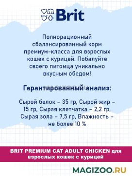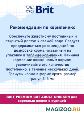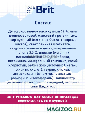 Корм Брит один из лучших для моего взрослого кота. Такой вывод я сделала после того, как полностью перевела его на этот корм. Он сбалансированный, питательный, без сомнительного состава. Курица в составе в достаточном процентном соотношении. Содержит витамины, полезные элементы. Как хозяйка, я довольна состоянием здоровья своего питомца.