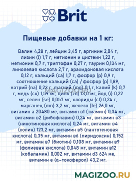 Рекомендации по кормлению: Обеспечьте животному постоянный и открытый доступ к свежей воде. Следует придерживаться рекомендаций по дозировке корма, указанным на упаковке в таблице кормления. Начиная кормление кошки новым кормом, увеличивайте его количество постепенно, в течение нескольких дней. Гранулы корма в форме круга, размер гранул 3-4 мм. Страна-производитель: Россия. Информация о составе и ингредиентах, цветовом решении, технических и иных характеристиках, стране-изготовителе, внешнем виде и комплекте поставки товара носит справочный характер и основана на последних доступных к моменту публикации сведениях. Доставка данного товара осуществляется во все регионы РФ.Здоровье питомца является главным принципом компании Brit-VAFO PRAHA. Корма под брендом BRIT производятся исключительно из натуральных и легко усваиваемых ингредиентов. В составе продукции нет сои и ГМО.