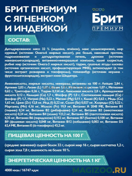 Состав: дегидрированное мясо 32 % (индейка, ягнёнок), маис цельнозерновой, жир куриный (источник Омега-6 жирных кислот), рис, маисовый протеин, гидролизованная и дегидратированная печень, дрожжи (источник маннанолигосахаридов), витаминно-минеральный комплекс, калий хлористый, рыбий жир (источник Омега-3 жирных кислот), таурин, клюква, антиоксидант (в том числе экстракт розмарина и токоферолы), топинамбур (источник инулина - фруктоолигосахаридов), экстракт юкки Шидигера.