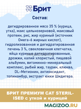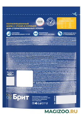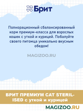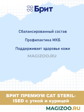 Питание хорошо подходит для стерилизованной кошки. Регулярно посещаем ветеринара. У нашей любимицы нет проблем со здоровьем при постоянном кормлении сухим продуктом от "Брит". Корм изготовлен в России, поэтому всегда есть в продаже. Гранулы с уткой и курицей аппетитно пахнут.