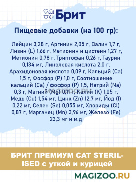 Питательные добавки на (100 гр): Лейцин 3,28 г, Аргинин 2,05 г, Валин 1,7 г, Лизин (L) 1,66 г, Метионин и цистеин 1,27 г, Метионин 0,78 г, Триптофан 0,26 г, Таурин 0,134 мг, Линолевая кислота 2,0 г, Арахидоновая кислота 0,09 г, Кальций (Ca) 1,5 г, Фосфор (P) 1,0 г, Соотношение кальций (Ca) / фосфор (P) 1,5, Натрий (Na) 0,3 г, Mагний (Mg) 0,11 г, Kалий (K) 1,05 г, Медь (Cu) 1,54 мг, Цинк (Zn) 12,7 мг, Йод (I) 0,22 мг, Селен (Se) 0,055 мг, Хлориды (Cl) 0,87 г, Марганец (Mn) 3,96 мг, Железо (Fe) 23,3 мг, Витамин А 20480 МЕ, Витамин В1 (тиамин) 0,34 мг, Витамин В2 (рибофлавин) 0,24 мг, Витамин В3 (никотиновая кислота) 0,24 мг, Витамин В4 (холин) 123,2 мг, Витамин В5 (пантотеновая кислота) 0,35 мг, Витамин В6 (пиридоксин) 0,152 мг, Витамин В7 (биотин) 0,108 мг, Витамин В9 (фолиевая кислота) 0,048 мг, Витамин В12 (кобаламин) 0,002 мг, Витамин D3 624 МЕ, Витамин Е (α–токоферол) 43,2 мг. Энергетическая ценность на 1 кг: 3760 ккал / 15732 кДж. Рекомендации по кормлению: Обеспечьте животному постоянный и открытый доступ к свежей воде. Следует придерживаться рекомендаций по дозировке корма, указанным на упаковке в таблице кормления. Начиная кормление кошки новым кормом, увеличивайте его количество постепенно, в течение нескольких дней. Гранулы корма в форме круга, размер гранул 3-4 мм. Страна-производитель: Россия. Информация о составе и ингредиентах, цветовом решении, технических и иных характеристиках, стране-изготовителе, внешнем виде и комплекте поставки товара носит справочный характер и основана на последних доступных к моменту публикации сведениях. Доставка данного товара осуществляется во все регионы РФ.Здоровье питомца является главным принципом компании Brit-VAFO PRAHA. Корма под брендом BRIT производятся исключительно из натуральных и легко усваиваемых ингредиентов. В составе продукции нет сои и ГМО.