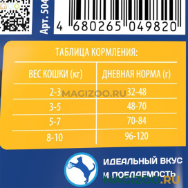 Этой пачки котейке хватает на месяц. Корм хорошего качества. Запах приятный, не такой химический как у дешевых кормов. Мой кот не жиреет, остается таким же игривым. В корме заложены важные элементы, с помощью которых они получают все витамины. Шерсть классная, здоровье крепкое.