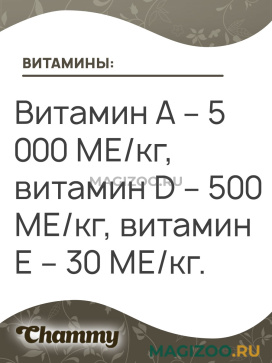 Информация о составе и ингредиентах, цветовом решении, технических и иных характеристиках, стране-изготовителе, внешнем виде и комплекте поставки товара носит справочный характер и основана на последних доступных к моменту публикации сведениях. Доставка данного товара осуществляется во все регионы РФ.Производство консервированного корма CHAMMY компания запустила осенью 2016 года и сразу же завоевала сердца домашних питомцев.