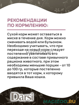 Сухие рационы под торговой маркой DARSI производятся по ГОСТ (Р 55453-2013) на заводе ООО «Провими Пет Фуд Рус» и относится к крупному холдингу Provimi Pet Food Голландия (производитель кормов для домашних животных на территории Западной и Восточной Европы, Азии и Южной Америки).