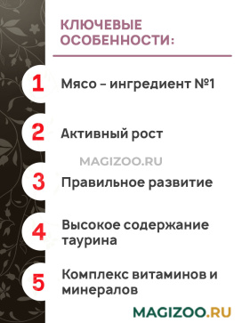 - Омега-3 и Омега-6, органический цинк — обеспечивают здоровую кожу и блестящую мягкую шерсть.