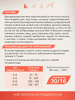 Дегидрированное мясо (птица, говядина), пшеница, животные жиры, кукуруза, растительная клетчатка, гидролизованные животные белки, кукурузный белок, дрожжи пивные, лососевый жир, витаминно-минеральный комплекс (витамины: A, D3, E, K, C, B1, B2, В3, B4, B5, B6, B9 (фолиевая кислота), B12, H (биотин) и микроэлементы: железо, медь, цинк, марганец, йод, селен, калий, магний, натрий), L-лизин, шиповника плоды, юкка шидигера (экстракт), DL-метионин, таурин, Bacillus subtilis, Bacillus licheniformis (пребиотик), антиоксиданты.