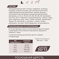 Дегидрированное мясо птицы, дегидрированое мясо рыбы (в т.ч. лосось), кукуруза, рис, животные жиры, растительная клетчатка, гидролизованные мясные белки, пивные дрожжи, лососевый жир, витаминно-минеральный комплекс (витамины: А, D3, Е, В1, В2, В3, В4, В5, В6, В9 (фолиевая кислота), В12, Н (биотин) и микроэлементы: железо, медь, цинк, марганец, йод, селен, калий, натрий), пробиотики, Таурин, DL-метионин, L-цистеин, L-лизин,, плоды шиповника, экстракт юкка шидигера, антиоксиданты.