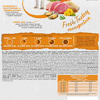 Мясо индейки 41 % (дегидрированное мясо индейки 26 %, свежее мясо и субпродукты индейки 15 %), ячмень, рис цельнозерновой, желтый горох, животный жир 8% (источник Омега-6 жирных кислот), гидролизованный животный белок 3 %, витаминно-минеральный комплекс, дрожжи инактивированные (источник маннанолигосахаридов), клетчатка свекловичная, рыбий жир (источник Омега-3 жирных кислот), корень цикория (источник фруктоолигосахаридов), холинхлорид, сушеное яблоко (источник растворимых пребиотических волокон), сушеный картофель, сушеная морковь, DL-метионин, юкка Шидигера, новозеландская мидия, одуванчик, льняное семя, розмарин, хондроитин, глюкозамин, антиоксидант (в том числе экстракт розмарина, натуральные токоферолы).