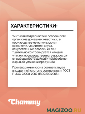 Информация о составе и ингредиентах, цветовом решении, технических и иных характеристиках, стране-изготовителе, внешнем виде и комплекте поставки товара носит справочный характер и основана на последних доступных к моменту публикации сведениях. Доставка данного товара осуществляется во все регионы РФ.Производство консервированного корма CHAMMY компания запустила осенью 2016 года и сразу же завоевала сердца домашних питомцев.